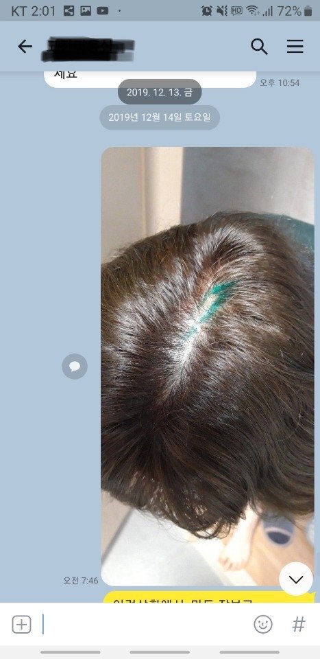 어머니가 미용실에서 원장님의 실수로 밑의 사진과 같이 두피에까지 염색약이 묻으셨습니다. 미용실에서 클리닉과 염색을하고 드라이까지 했기때문에 분명 보였을텐데도 그냥 이대로 돌려보냈고 어머니는 다음날 아침(일요일에 미용실을 갔기에) 출근준비를 하시면서발견하셨습니다. 두피에까지 묻어 세네번 정도 손톱으로 긁어가며 샴푸를 한 다음에서야 약이 빠져 출근을 하실 수 있었습니다.