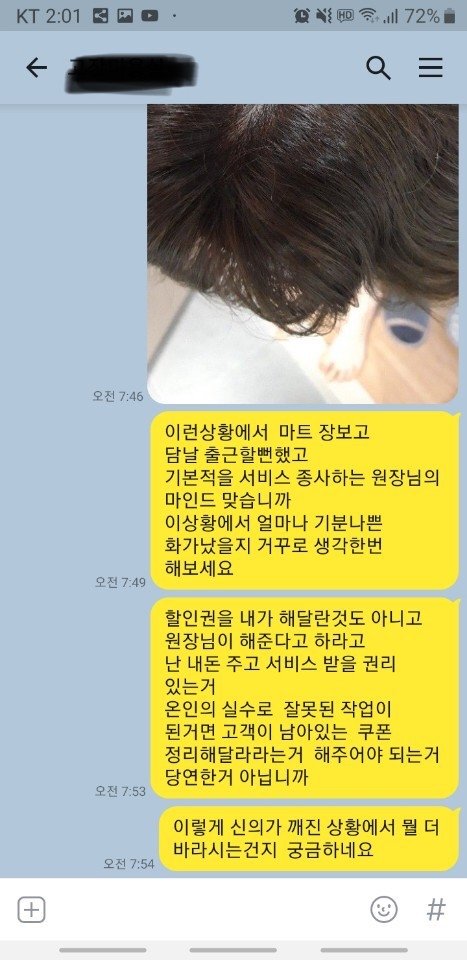 안녕하세요. 제 질문은 ‘미용실 원장님의 실수로 두피에 염색약이 묻었고, 쿠폰을 끊었었는데 나머지 이용 안한 부분에 대해 환불을 받을 수 있는가’ 입니다. 밑에서부턴 자세한 상황이고 다소 장문인 점 양해부탁드려요.