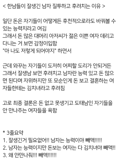 양심선언) 나 남자이고 남자들 질투 심한거 인정함. 여자들은 질투를 티내면서 하지만 남자는 아닌척 애써 감추기 때문에 더 욕먹는거임 그냥 솔직하게 드러내자. 정신승리 자기합리화 이것도 다 맞는말임. 잘생긴 남자 인정하기 싫어서 발악하는것도 여럿 봄
