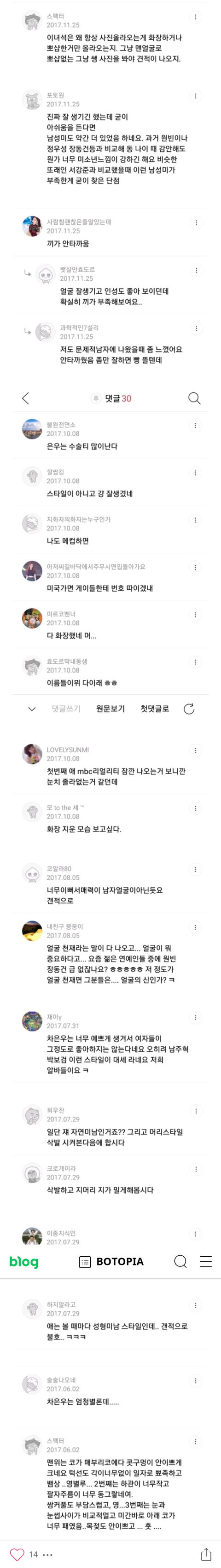 본문에 '나도 메컵하면' 이거보고 기가막혀서 댓글씀 ㅋㅋㅋㅋ 자 여기 차은우 쌩얼 ㅋㅋㅋㅋㅋㅋ 무슨 화장이 마법인줄아네 현실 화장은 자기 본판에서 그냥 보정만되는 수준임 ㅋㅋㅋ 어디 중국여자들 빻은얼굴 변장해서 뽀샵까지 극단적으로 떡칠한거보고 그게 리얼 화장인줄 앎 ㅋㅋㅋㅋㅋ 착각 좀 하지마라 ㅋㅋ 정 못믿겠으면 당장 니얼굴에 메이크업해봐라 그얼굴 어디 가는지 ㅋㅋㅋㅋ