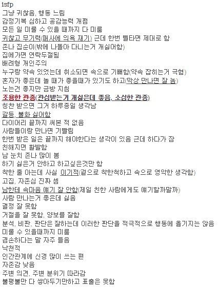나 ㄹㅇ 나랑다똑같아서 소름돋앗는데 너네도그래? 글고 isfp아닌애들은 밑에 항목들 보면 와 진짜 나랑 다르다 이래?!