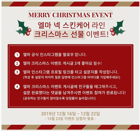 엘마에서 크리스마스 이벤트를 진행 중입니다. 이벤트 참여자 중 엘마 마이크로어레이패치 1분, 엘마 리쥬베 앰플 1분께 선물해드릴 예정이니 많은 참여 부탁드립니다.^^