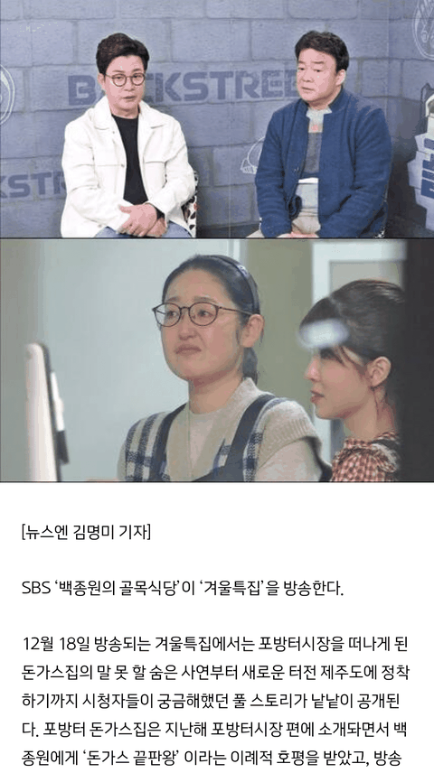 SBS '백종원의 골목식당'이 오늘(18일)부터 '겨울특집'을 방송한다.이번 겨울특집에서는 포방터시장을 떠나게 된 돈가스집의 말 못 할 숨은 사연부터 새로운 터전 제주도에 정착하기까지 시청자들이 궁금해했던 풀 스토리가 낱낱이 공개된다. 포방터 돈가스집은 지난해 포방터시장 편에 소개돠면서 백종원에게 '돈가스 끝판왕' 이라는 이례적 호평을 받았고, 방송 이후에는 이른 새벽부터 대기 줄로 인산인해를 이루며 폭발적 관심을 받았다.