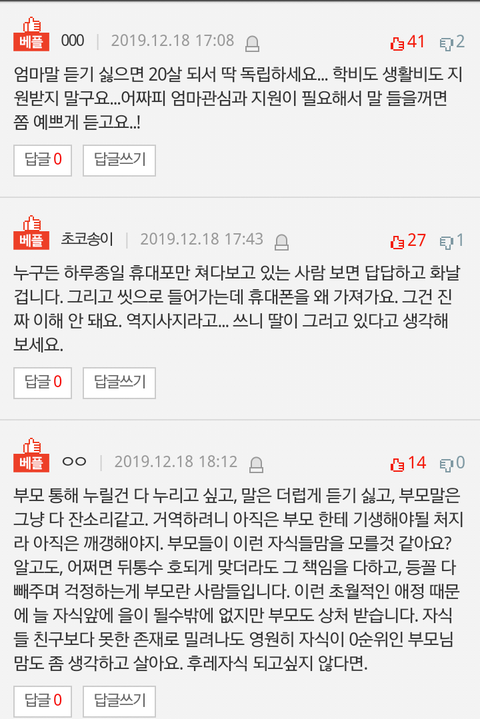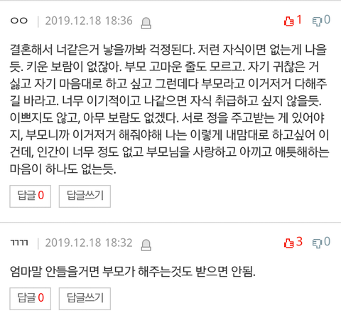 사실 저건 그나마 약한 편인데 평소에도 어린 자식들이랑 부모랑 갈등하는 글 보면 죄다 엄마말 듣기 싫으면 독립해라 이런 댓글뿐임;;