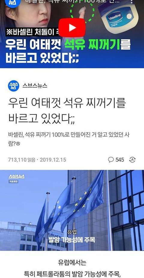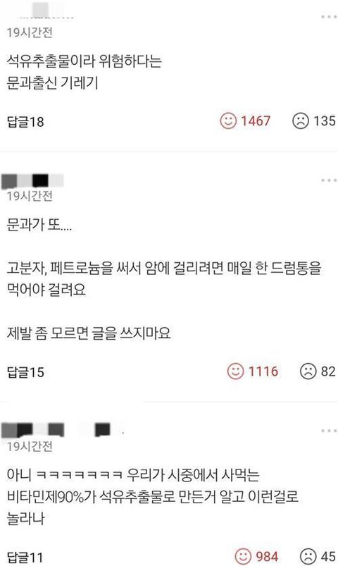 기레기는 문과라서 문제가 아니라 멍청해서 문제지.석유 끓는점 과학시간에 중학교때 배우면서 졸았나? 바르는 바세린이 석유 부산물이라서 놀라셨쎄요? 식품보존제도 석유 부산물이고 약도 석유들어간거 있는데? 기레기 아스피린 못먹겠다.우짜지?