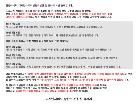 알다시피 우리는 멤버들 개개인 별로 제3자 고소고발 진행하는 곳들이 있음. 오늘 그 곳 중에 한 곳에서 아래와 같은 지금 상황을 공지함