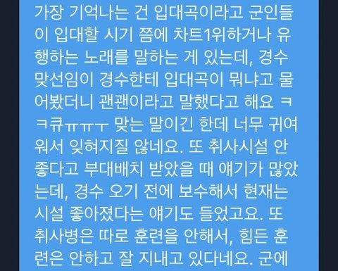 보통은 입대 당시에 제일 유행하고 인기 있던 노래를 입대곡이라며 얘기하는 규나 ㅎㅎ