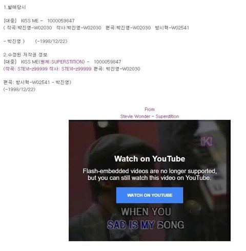 제왑삐 팬들 몰려와서 아니라고 우기기 전에, 일단 이건 법적으로 표절 확정 된곡들이고 표절은 엄연히 잘못된 일이야. 법적으로도 그리고 도덕적으로도. 남이 피땀눈물 흘리며 만든곡을 손도 안되고 자기껄로 만들고 그리고 그 행위를 반복한다는건 자기 잘못을 인지를 못하는거고 표절을 가볍게 여기는거지. 아이유만 봐도 표절의혹글들 수두룩 한데 박진영은 단한번도 언급이 없길래.
