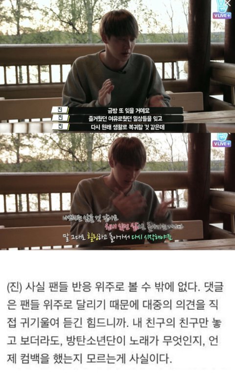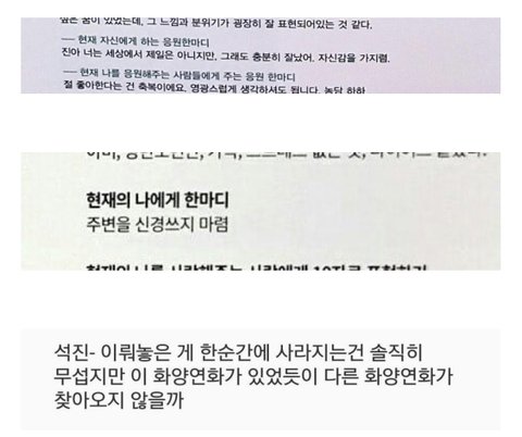 내 말을 들어 저건 그 전날 외국팬이 "내 말을 들어 석진, 우리 모두가 오랜 시간 동안 다시 필요 다시 검은 머리로 이동" 이라는 트윗을 시작으로 실트까지 올랐던 것을 석진이가 센스있게 사용 ㅋㅋㅋㅋ 팬잘알 석진 모먼트는 너무 많지 본4야지에서 팬들은 꼬질한 모습을 더 좋아해 라던지 최근 타이밍이 어쩜 그렇게 기막힐 정도로 찾아와 우리를 달래줬는지