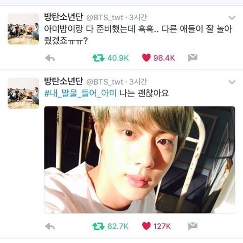 멤버피셜 진은 엄마를 가장 많이 찾는 멤버라고ㅋㅋㅋ 엄마랑 한시간씩 통화하기도 하고