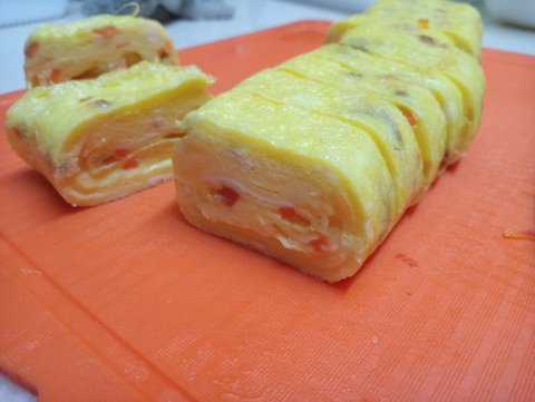 약불에 기름 조금만 두르고(키친타올로 고르게) 접어가며 익히면 돼요. 중간은 엉망이어도 되고 마지막 부분을만 모양 잘 잡아주면 돼요. 사진은 당근다져넣어서 한거...