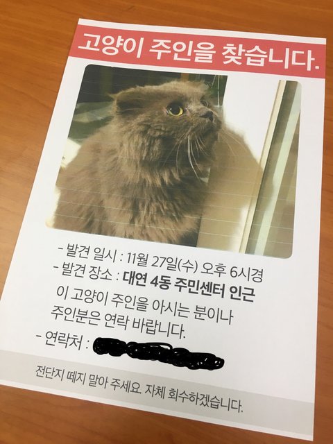 이 아이가 주인이 있을거라 굳게 믿은이유가. 목뒤에 에드보켓 흔적 때문이었음. 고양이 집사님들 대부분 11월 같은 모기가 안다니는 계절에는 에드보켓을 잘 안하는데. 에드보켓까지 한걸보니 집에서 참 애지중지 하고 키우나보다 하고 금방 주인이 나타날거라 기대하고 전단지를 제작해서 근처 동물병원이랑 애완동물 간식집에 붙였음.