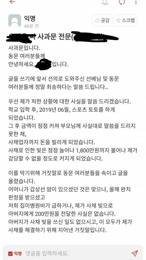 8. 결국 사과문 작성. 어머니가 암에 걸리셨는데 뭔가 보탬이 되고 싶어 200만원의 사채를 빌려 가져다 드렸고, 매달 40만원 50만원씩 이자를 갚다 보니 1800만원이 되었다고 해명