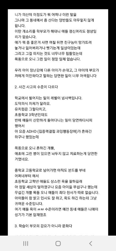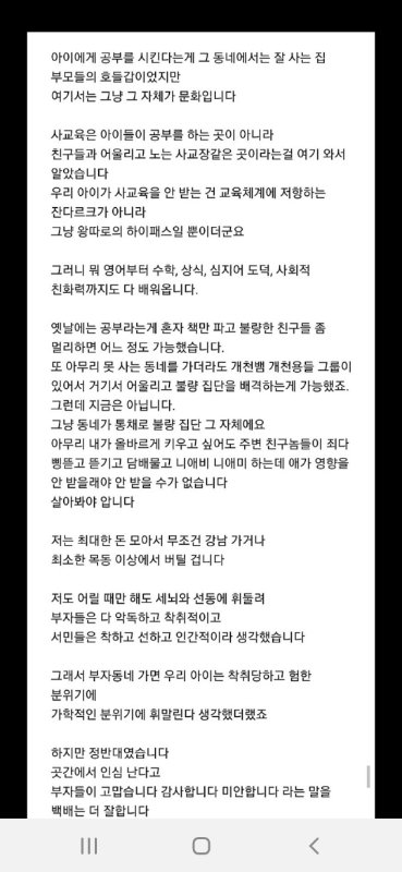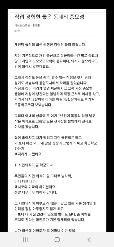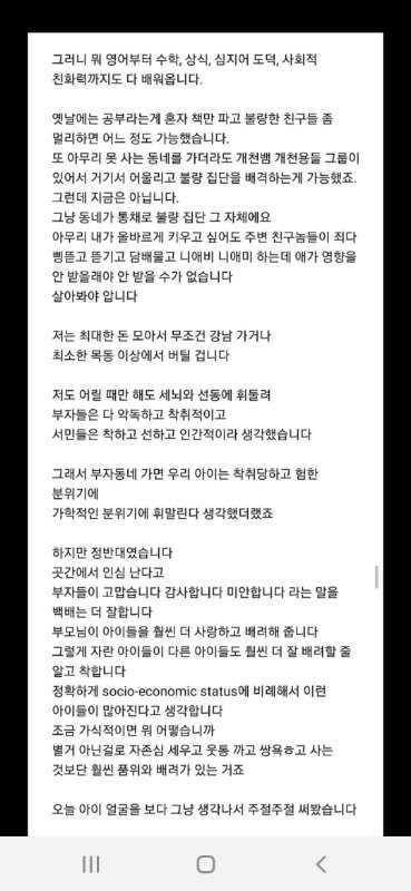 글쎄 난 서초구에서만 30년 넘게 살아서 다른 곳과 비교는 힘듭니다만...최소한 딱 한 가지는 확실합니다. 내가 우리 애들 데리고 길을 걸어요. 그럼 우리 동네에서는 담배피는 사람들이 잠시 담배 피는 걸 멈추거나 한 걸음 뒤로 물러 섭니다. 100%는 아니지만...10명 중 7~8명은 그럽니다. 그런데 다른 동네서는...애들이 지나가든 말든 전혀 신경 안 쓰더군요. 다른 건 제가 살아보지 않아서 비교할 수 없지만 길을 걸을 때 그 차이는 분명하게 느낍니다. 문화 의식의 차이랄까요?
