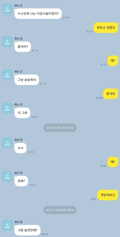 연락 안 한다더니 갑자기 연락 옴 내 생각엔 여자 없어서 이러는 거 같거든 너넨 어떻게 생각해??
