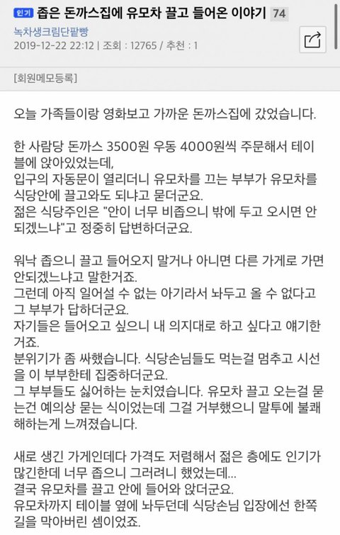 좁은 가게면 부부 잘못이지.돈까스맛 어차피 돈까스 맛인데 좀 큰가게를 가야지.테이블 4개 미만인 가게나 일직집 다찌만 있는 가게면 유모차 못들어가지.독특하네 아기부모.가게 주인이 억지 쓰는거면 더러워서 안갈거고 진짜 좁으면 본인들이 피해서 안갈텐데 그 동네는 돈까스 집이 하난가?
