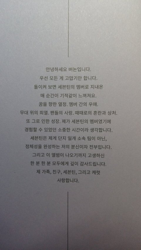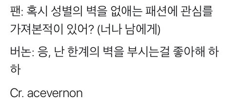 +팬들에게 하고싶은 말 :캐럿들에게 감사드립니다. 너무 당연한 거지만 여러분들 없이 저희는 아무것도 할 수 없었을 거예요. 덕분에 일생일대에 올까 말까 한 그런 소중한 경험들을 정말 많이 얻을 수 있었습니다. 그만큼 팬 여러분들께 그리고 "세상에 보답할 수 있는" 세븐틴의 버논이 되겠습니다. 감사합니다. << 이것만 봐도 알 수 있음.