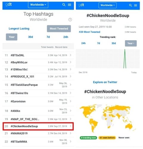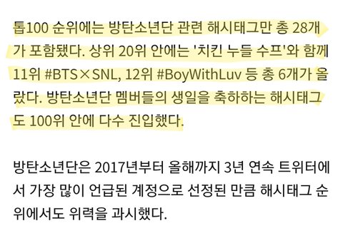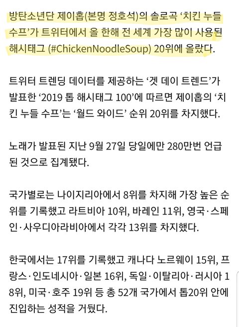 에쎈엘 해시 11위 작은시 해시 12위 등등 추카추카포카포카 https://n.news.naver.com/entertain/article/022/0003424604?lfrom=twitter