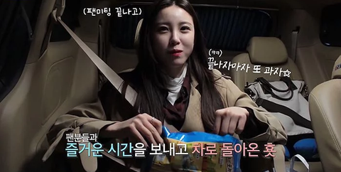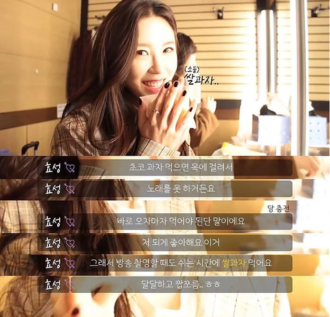팬미팅 리허설 전 준비할 때 쌀과자 오도독