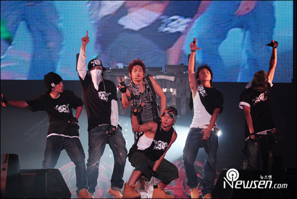 지누션과 세븐 원타임 등이 슈퍼주니어 패러디 무대를 꾸미고 있다.