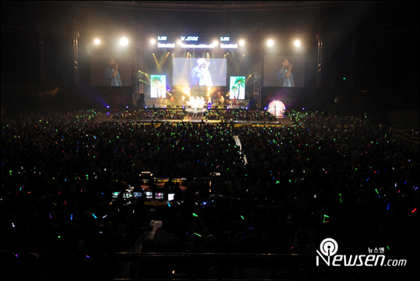 yg패밀리 합동공연 마지막 순서에서 양현석(가운데)가 소속가수들의 노래요청에 당황한 표정을 짓고 있다.