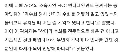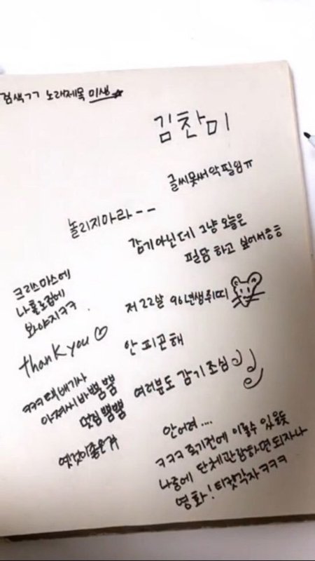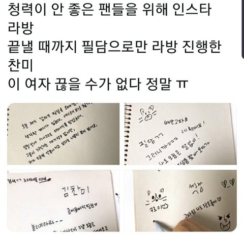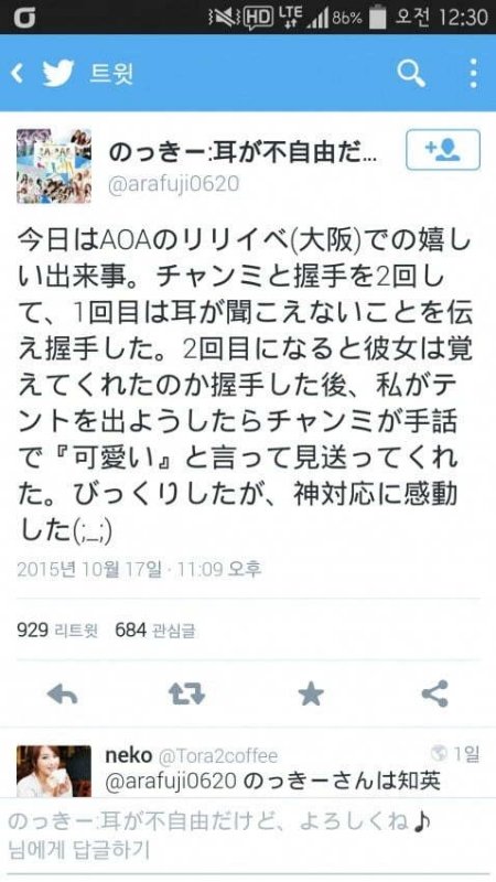 오늘 AOA의 오사카 악수회에서 기쁜 일이 있었다. 찬미와 두 번 악수를 했다 첫 번째 악수를 할 때 찬미에게 나는 귀가 들리지 않는다고 얘기했다. 이후 두 번째 악수회 때 만났을 때 찬미가 내게 인사를 한 뒤 수화로 ‘예뻐요’라고 말해줬다