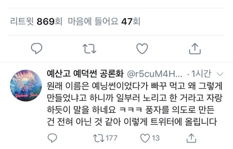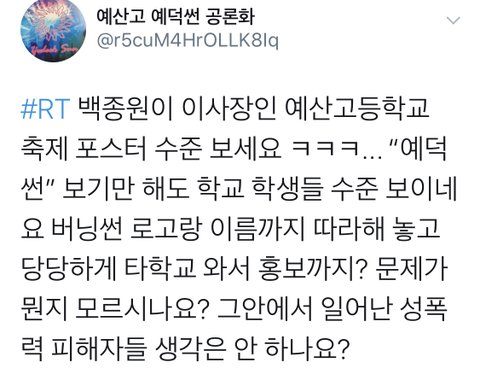 얘들아 예산에 백종원 이사장인 예산고등학교 축제 버닝썬 이름 연관지어서 예덕썬이라고 지음 ㅋㅋㅋㅋㅋㅋ 생각없이 사는 듯 ㅋㅋㅋㅋㅋ 심지어 여기 남고다 ^^ 진짜 왜이럴까 ㅠㅜㅜㅜㅜ 주변에 여고도 있음 ㅋㅋㅋㅋㅋㅋㅋㅋ 개싫어ㅠㅠㅜ
