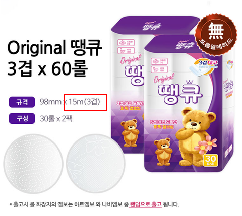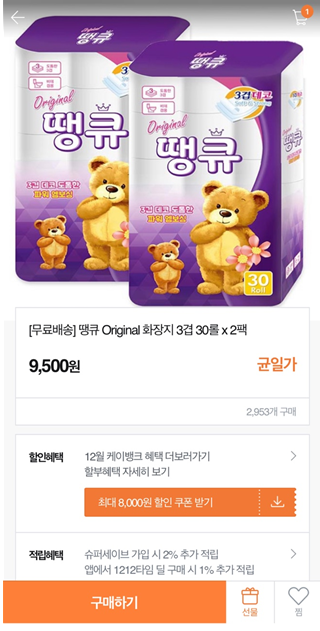 위메프와 티몬에서 Original 땡큐 화장지 3겹 30롤 x 1팩 휴지를 구매함