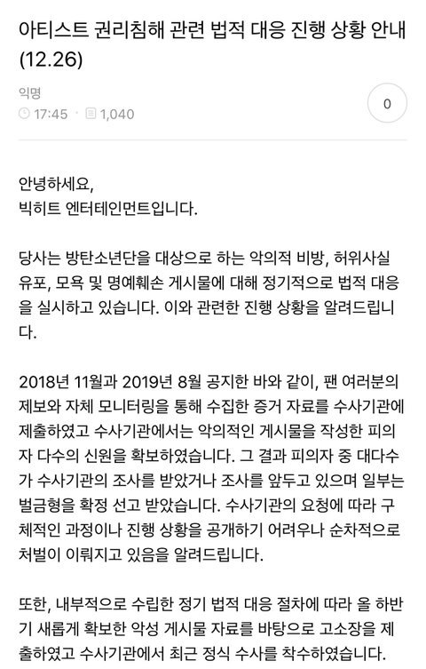 빅히트 고소 공지 전문(12.26 ver)