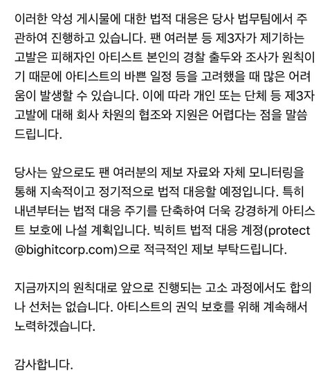 빅히트는 다른건 모르겠지만 아티스트는 끔찍히 아낀다 고소고발 대응기간을 단축해서 더 많이, 더 자주 그리고 지속적 고소를 강경대응하겠다네 ㅎㅎ