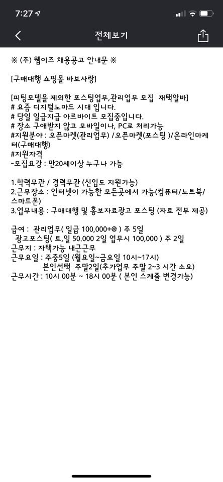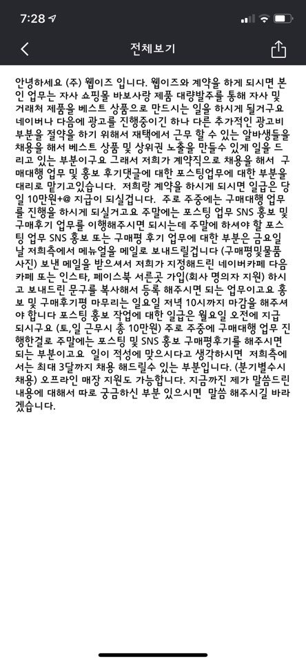일단 저는 알바몬에서 재택알바를 구해볼려고 몇일간 검색을 하다가 (웹이즈)바보사랑 이라는 회사에서 재택알바 일당 10만원이라고 해서 일단 지원을 했습니다. 그다음 카톡으로 연락이 와서 주고 받은 내용입니다.