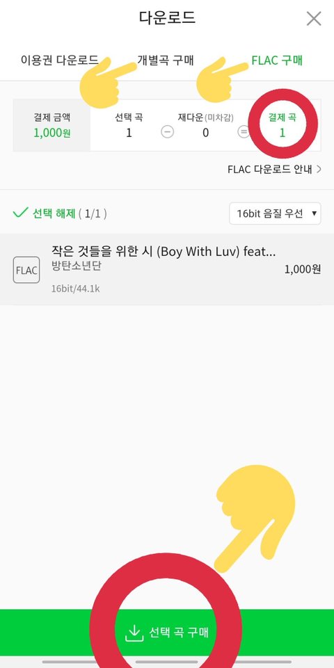 다운로드 하는 방법 - 안드는 모바일, 웹 가능 - 어른폰은 웹만 가능 - 개별곡, flac 둘다 다운 가능(각각 집계)