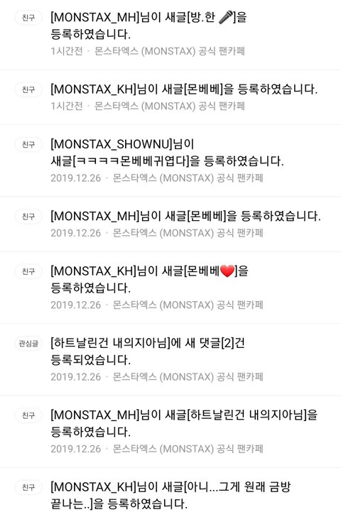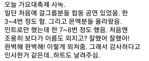 오늘 몬엑 가요대축제 사녹했는데 몬베베는 없고 에핑레벨트와방탄팬들만 있었단 말임 근데 아미들이 몬엑무대끝나고 막 잘했다~! 잘했어~! 완벽해!! 하면서 응원해주니까 몬엑이 아미들한테 하트 개많이 날려줘서 몬베베들 삐져서 공카로 미안하다하고 셀카 올리고 있음ㅋㅋㅋㅋㅋㅋㅋ
