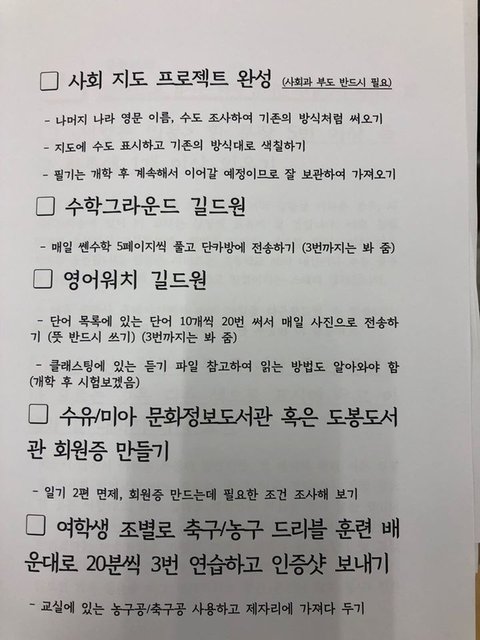 공통으로 해오라는거 보면.. 생존신고는 교사로서 학생 안위 챙기는 거고, 일기10편은 일주일하고 3일 좀 쓰면 되는거니 개꿀딱이고, 사회과부도 숙제는 작년의 나였다면 그걸 굳이 왜 해? 했을텐데, 올해 영국이 섬이냐 아니냐로 커뮤들 불탔던거 생각하면 필수라는 생각이 든다ㅋㅋ 상식없는 친구들이 너무 많더라.. 수학 영어도 뭐 대단히 번거로운 것도 아니고.. 방학이라고 집에만 있지 말고 운동 좀 하라고 그것도 공놀이 하라고 챙겨주신거 보면 ㄹㅇ찐선생님이시네,, 뒤에 선택으로 붙인 숙제들도 다 중고등학교 대비해서 조금씩 해두면 좋은 것들,, 천일문 좋다고 추천해주신거 보면 진짜 알아보신 티 나서 더 좋아보임ㅋㅋ 꼬맹이들 겨울방학 건강하게 재밌게 알차게 잘 보내고 중학교 생활도 화이팅하길