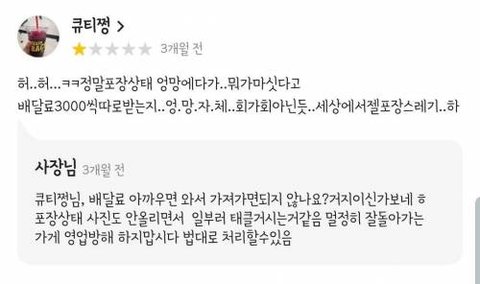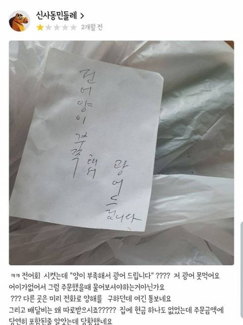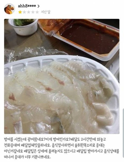 양이 적은것도 배달이 늦은것도 가게 특성이라고 주장하면 그래 니네 가게는 그따위인갑다 하지만 방어를 시켰는데 광어가 오고 전어를 시켰는데 광어가 오는건 기본 주문이 틀려지는건데 이건 변명 여지도 없지.