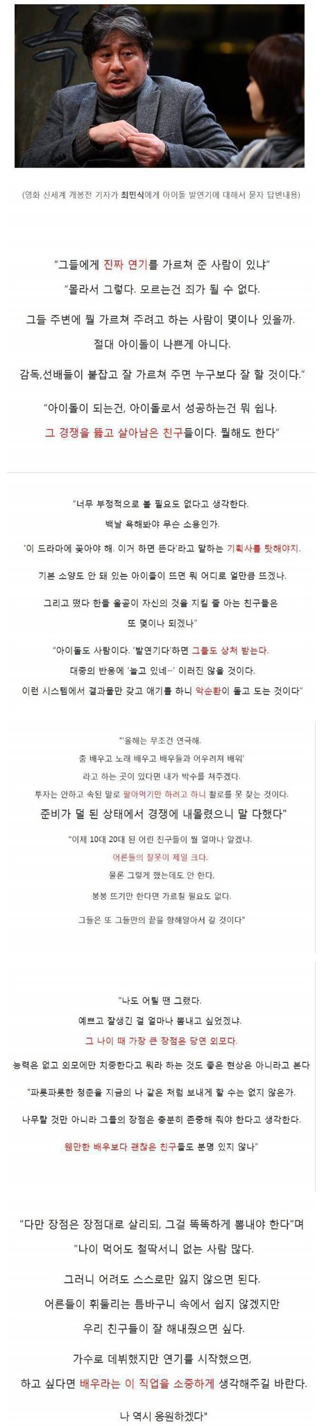 난 이거 보고 최민식님 마인드 진짜 대단하다고 느낌 아이돌 발연기에 대한 답변인데 꼰대랑은 정반대임 진짜 공감...