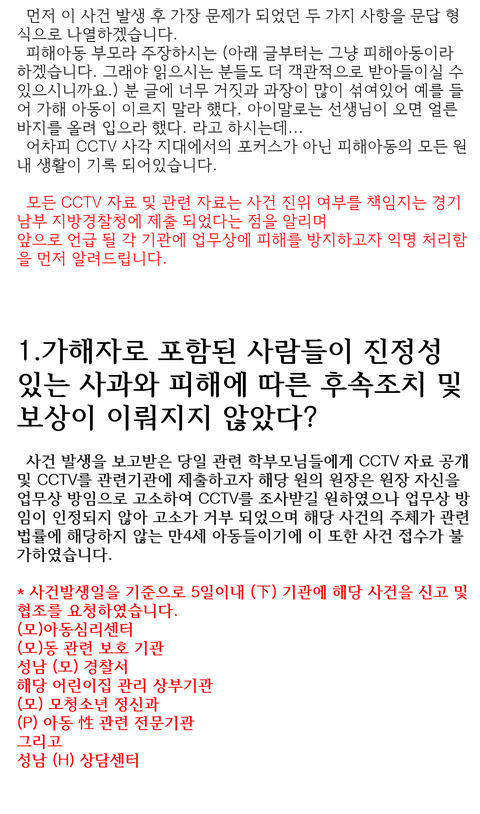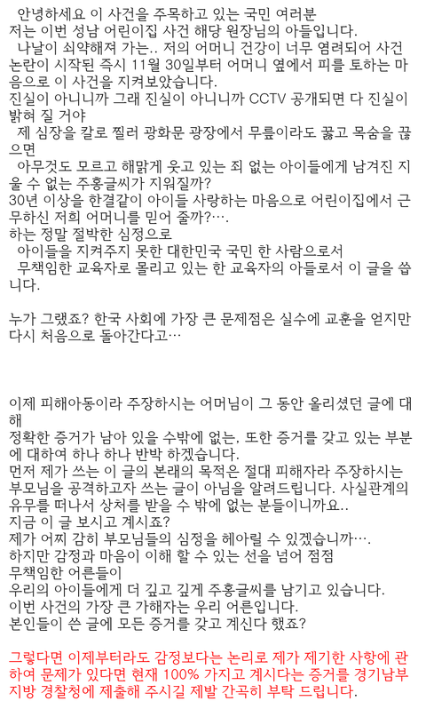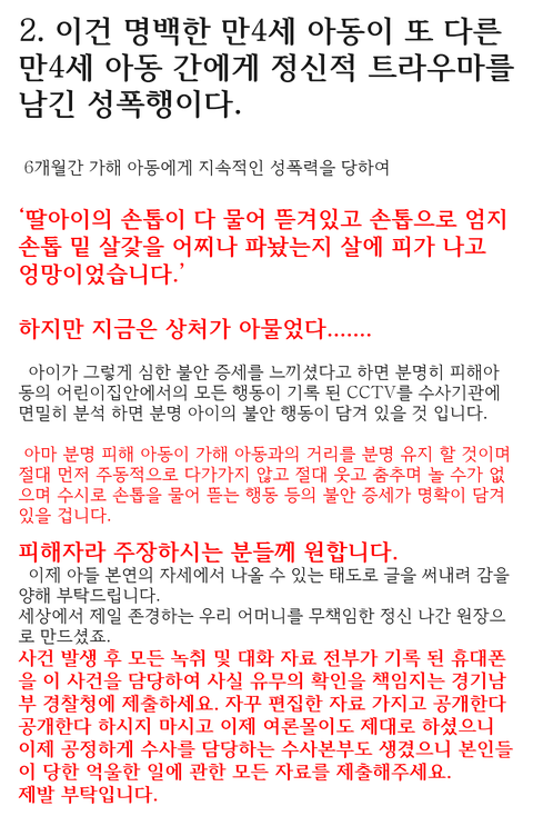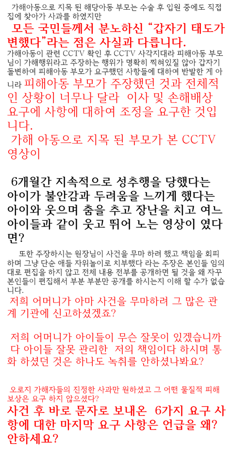 본인 어머니라서 팔이 안으로 굽는 건 알겠지만 보고 있자니 참 역겹네요. 제가 보기엔 사건의 본질을 흐리고 물타기하는 건 원장의 아들인 당신 같은데요. 가해 아동이 몇살이 됐든 알고 했든 모르고 했든 성적으로 수치심이 들게 하고 가슴 깊이 상처를 남기는 성범죄를 저지른 건 팩트입니다.