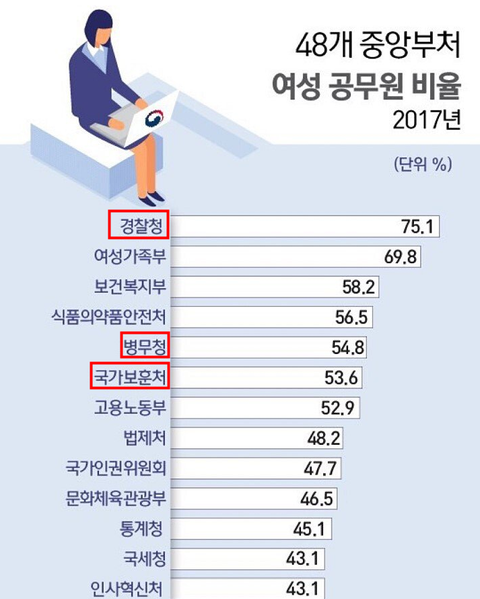 공무원 여성비율이 과반수가 넘어서 양성평등을 이룩한 곳중에 경찰청이랑 병무청 국가보훈처도 있는건 예외네요ㅋㅋㅋ