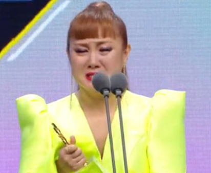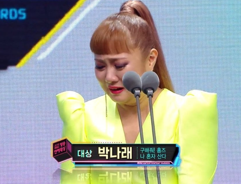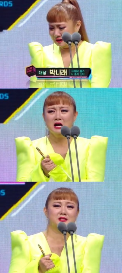 눈물을 흘리며 트로피를 받아든 박나래는