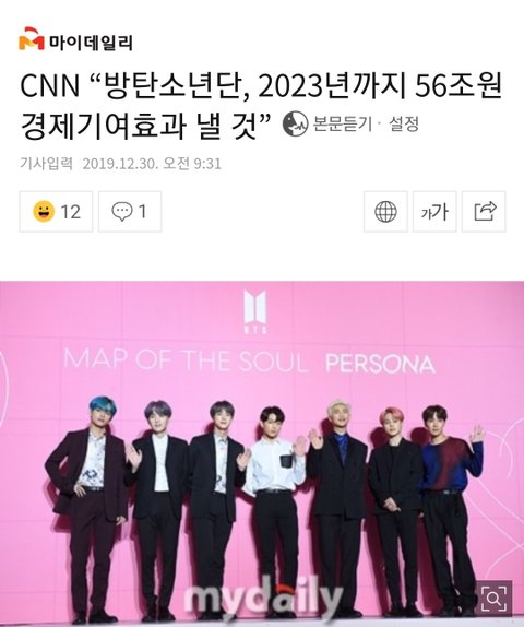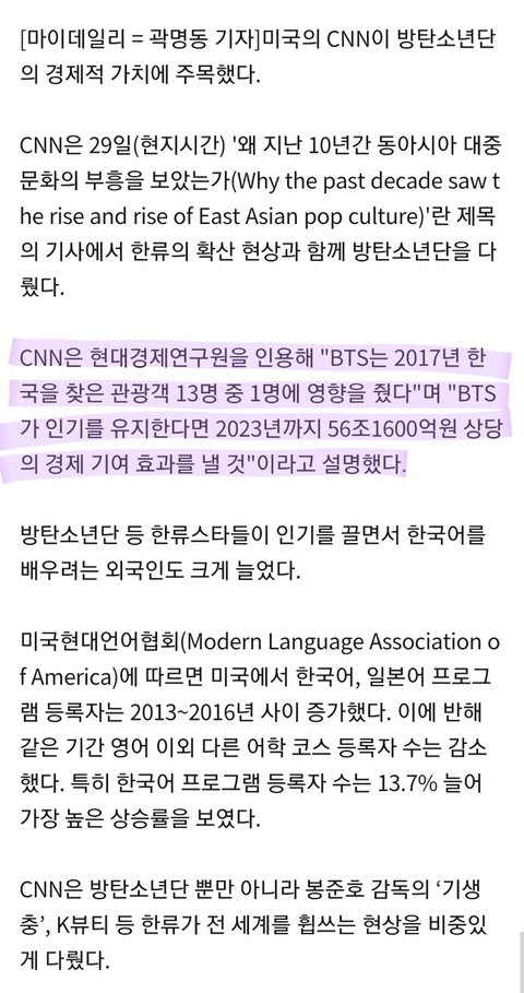CNN “방탄소년단, 2023년까지 56조원 경제기여효과 낼 것”