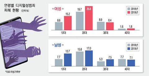 피해자 중 나이 공개를 원하지 않은 사람을 제외하고 연령을 분석하면 20대가 479명(24.8%)으로 최다였다. 이어 10대 291명, 30대 160명, 40대 47명, 50대 이상 30명 순이었다.