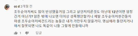 참고로 맨 위에 링크된 영상은 네이트판에 올라온 '조두순 출소날 죽이고 오겠다는 내용의 글'을 소개하는 영상입니다.
