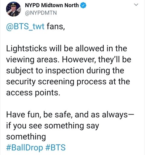 뉴욕 타임스퀘어 행사에 방탄소년단 응원봉 소지해도 되냐는 문의가 많아 NYPD 계정에서 직접 답변함