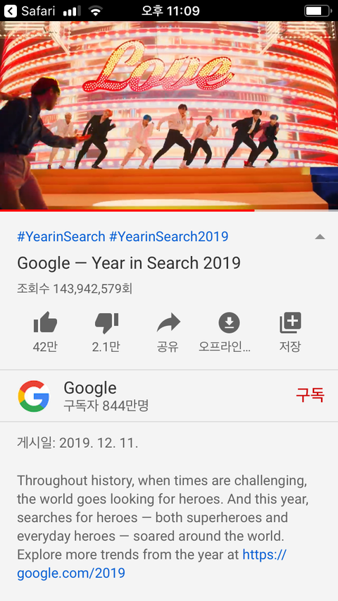 지금 티비 보는데 구글에서 만든 year in serch 2019 비디오에 방탄 분들 나오는 거 알고 있었니..? 주제가 히어로 인데 새삼 너무 대단해서