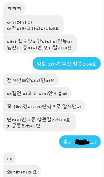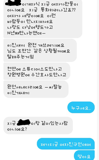 "지금남자친구가 전화기 꺼놓지말라고해서 켜놓은상태야 ~ 남편욕설자제좀 ㅎㅎ"