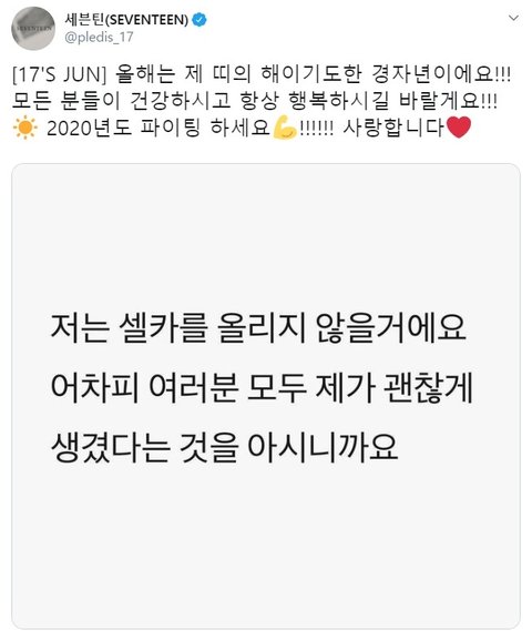 새해에는 더 잘생겨지고 더 귀여워지자 쭌아ㅎㅎㅎ활동중단한 정한이랑 승철이 영상도 올라옴ㅠ