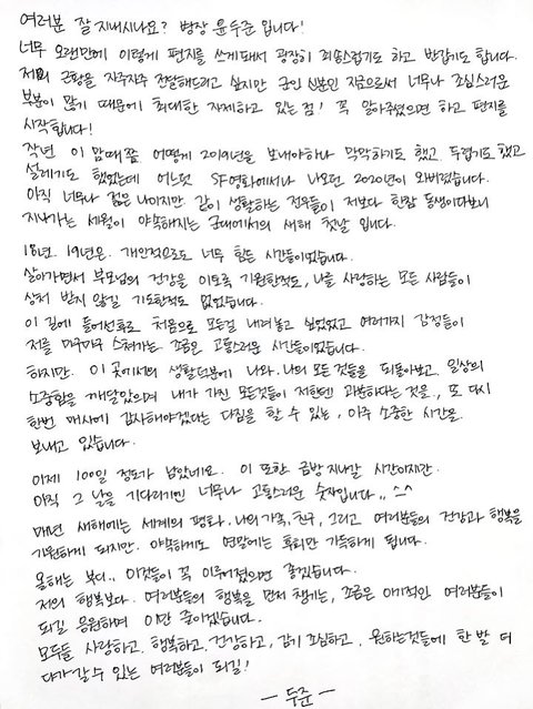 새해 되자마자 두준이가 팬들에게 편지 보냄ㅜ