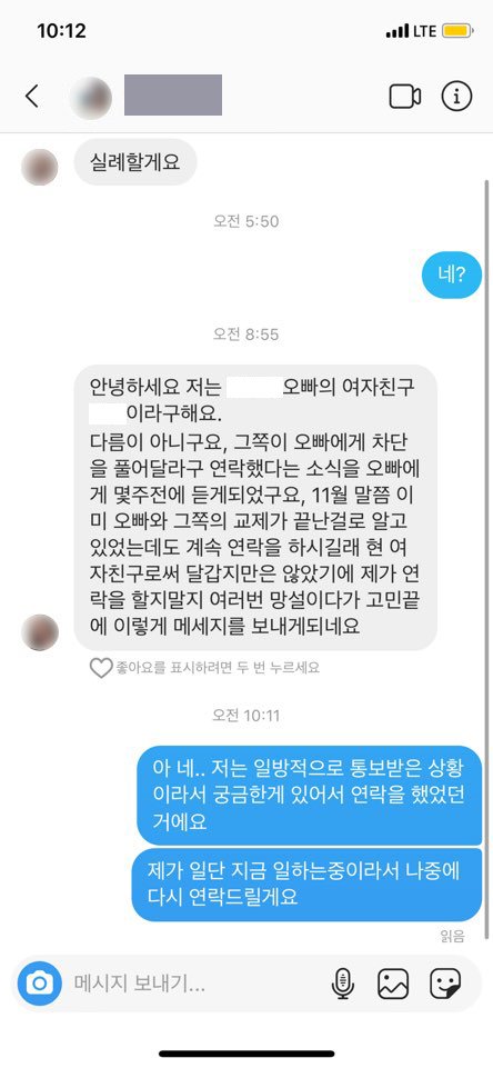 자기가 ㅇㅇ여자친군데 자꾸 연락하지말아달라는 식의 내용으로 연락이 와있었어요