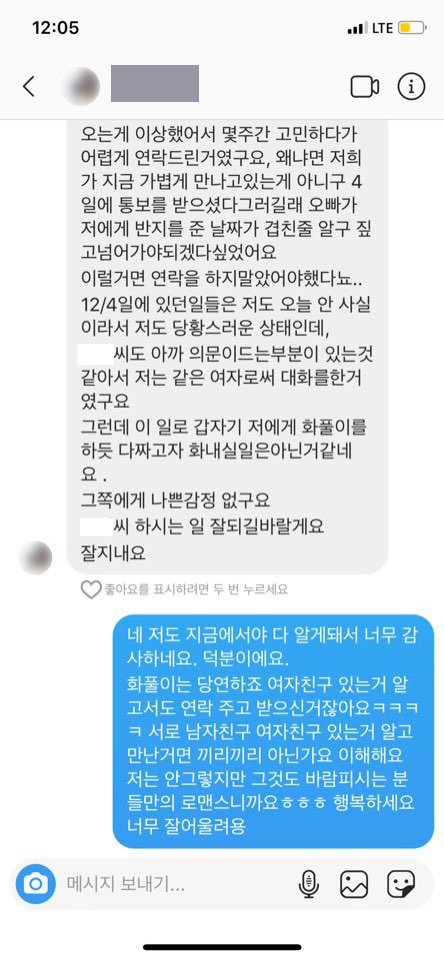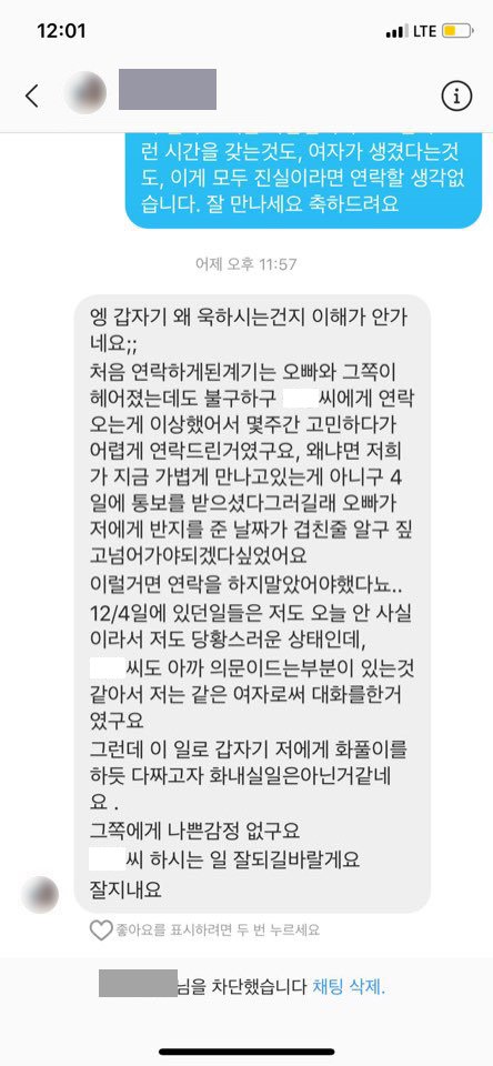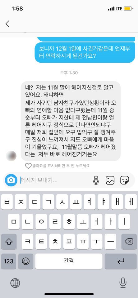 네.. 그렇게 해어지자마자 바로 이틀지난 12월6일 그 사람의 상태명이 00(남자이니셜)00(여자이니셜) 12.1~이라고 변경되어있는걸 보고 이게 무슨상황인가 연락을 하게되었습니다.
