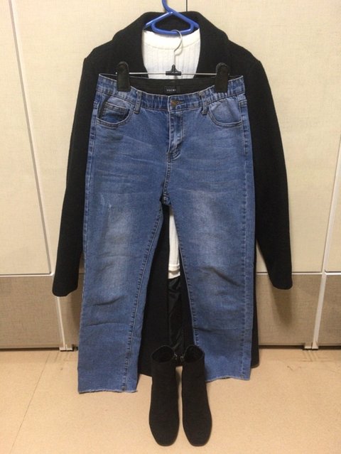 이 코디 어때요? ㅠㅠㅠㅠ검은코트에 아이보리 좀 얇은 니트에다가 중청 청바지 그리고 검은색 앵클부츠예요!